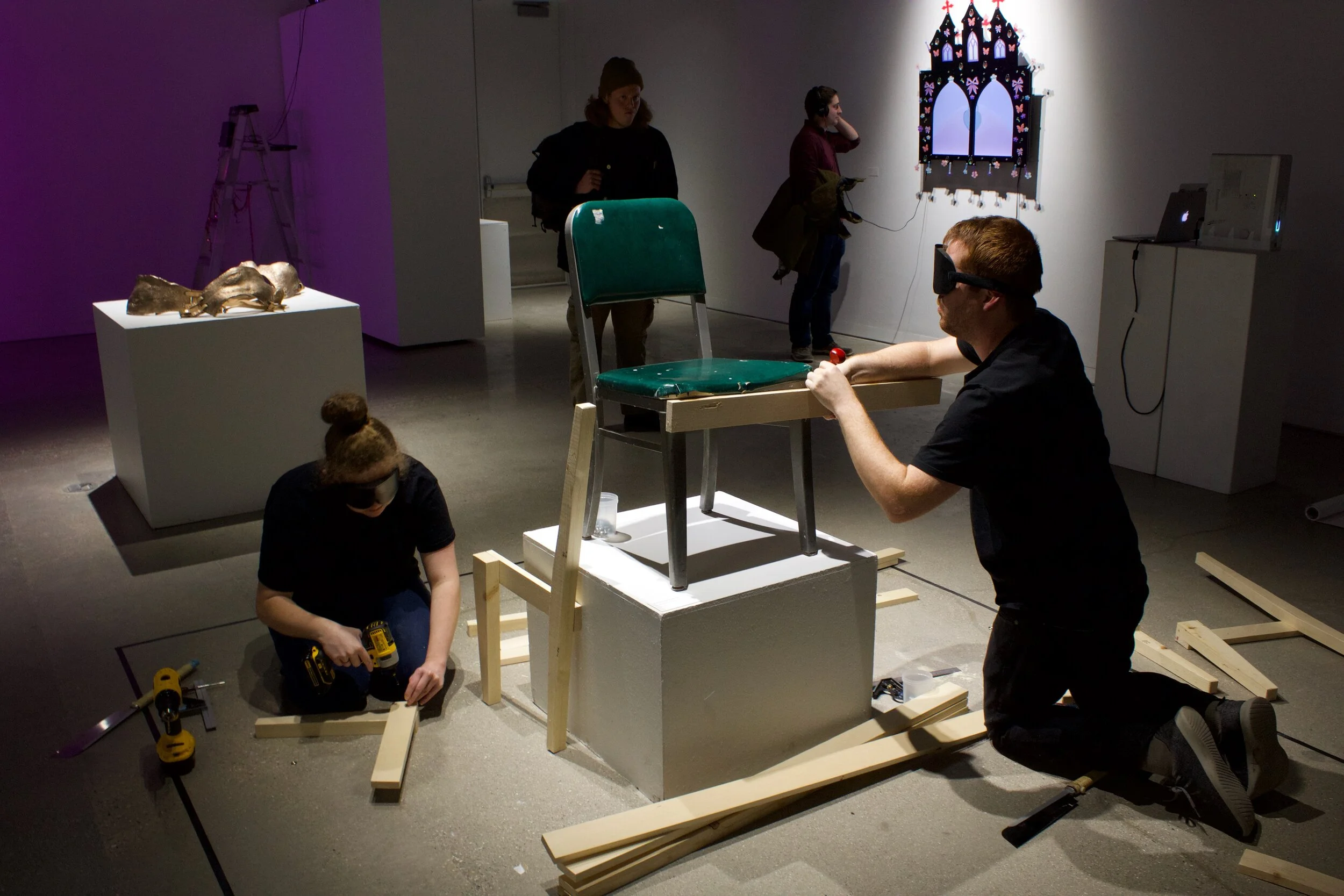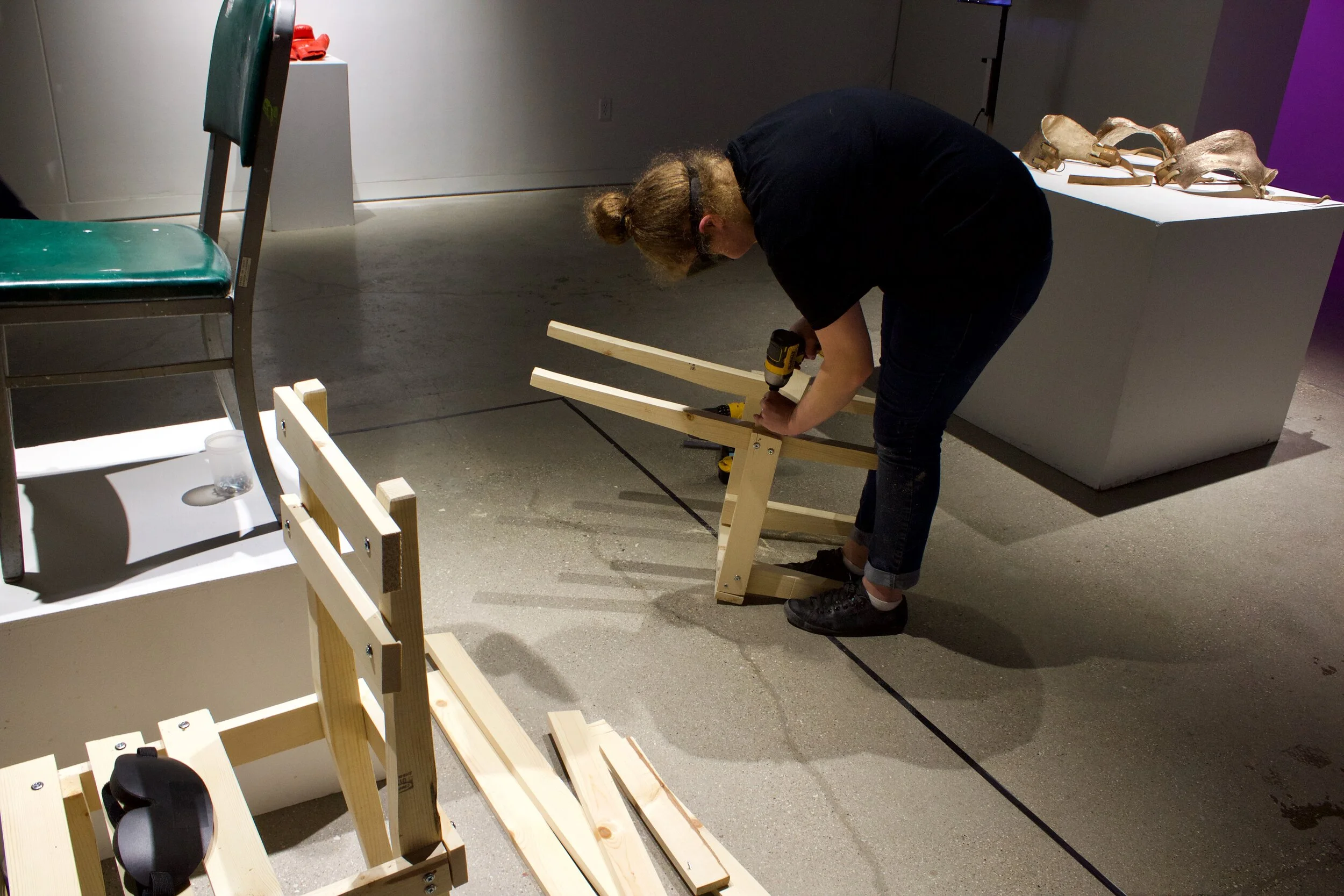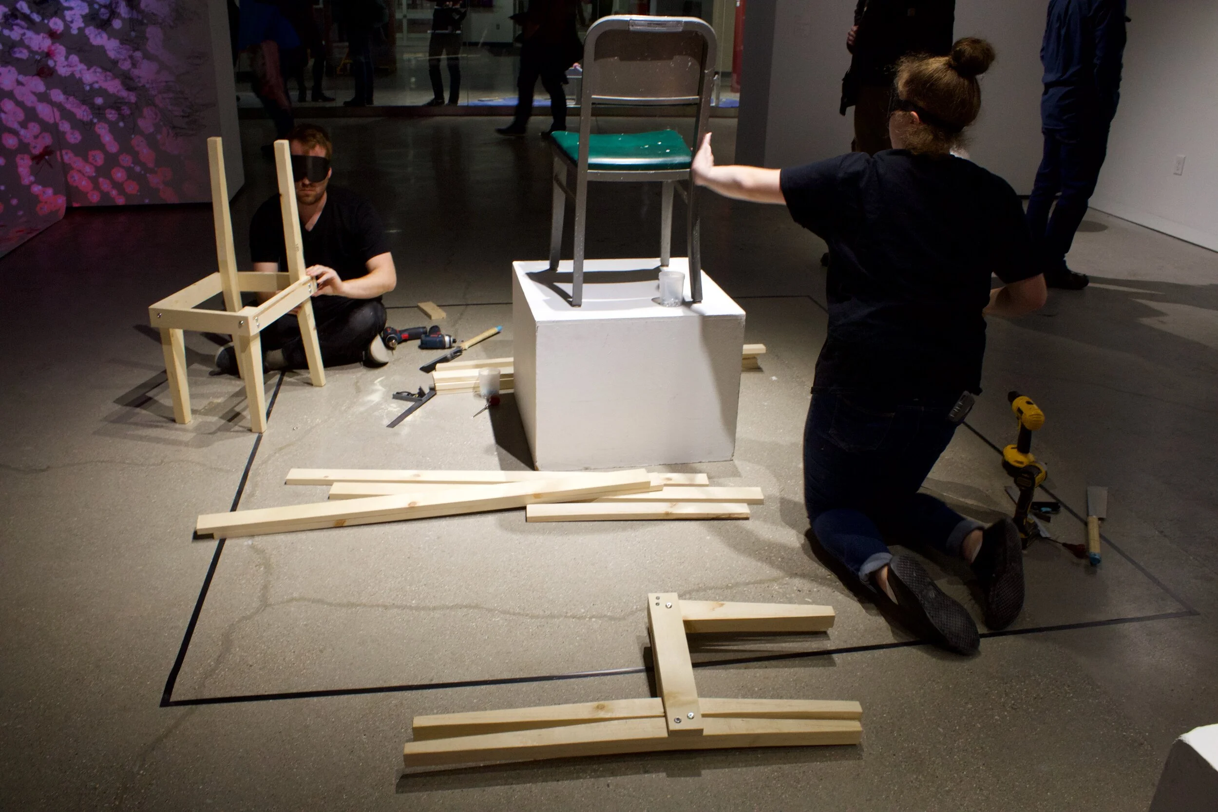 Blind Reproduction (Nov 19) was a collaboration with Elizabeth Sheeler to reconstruct a found chair while blindfolded. The blindfold acted as a mechanism to equalize each performer, myself having ten years of experience as a carpenter, Elizabeth being legally blind. The end result highlights both our similarities and differences through process and product. Photos by Hong Huo.