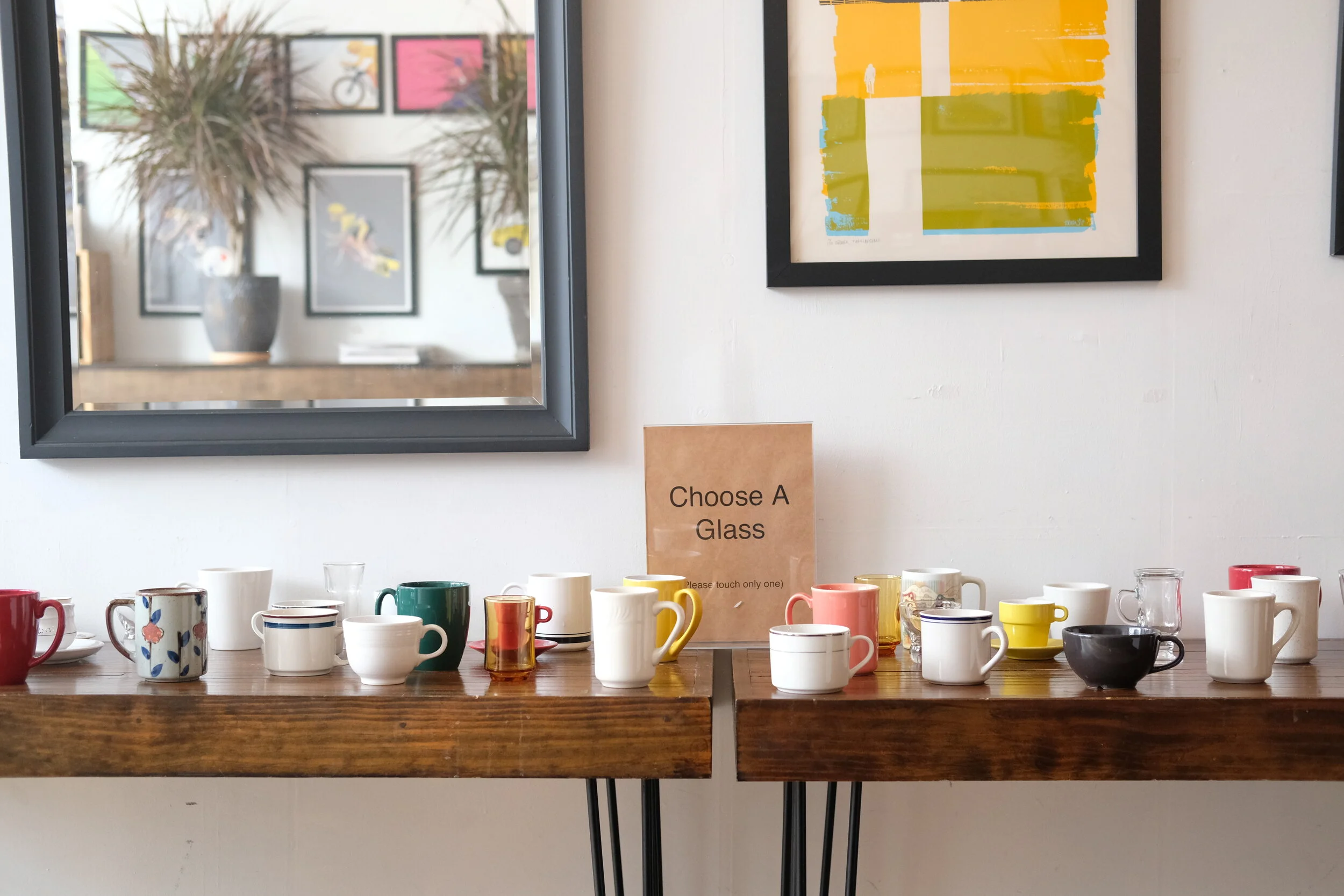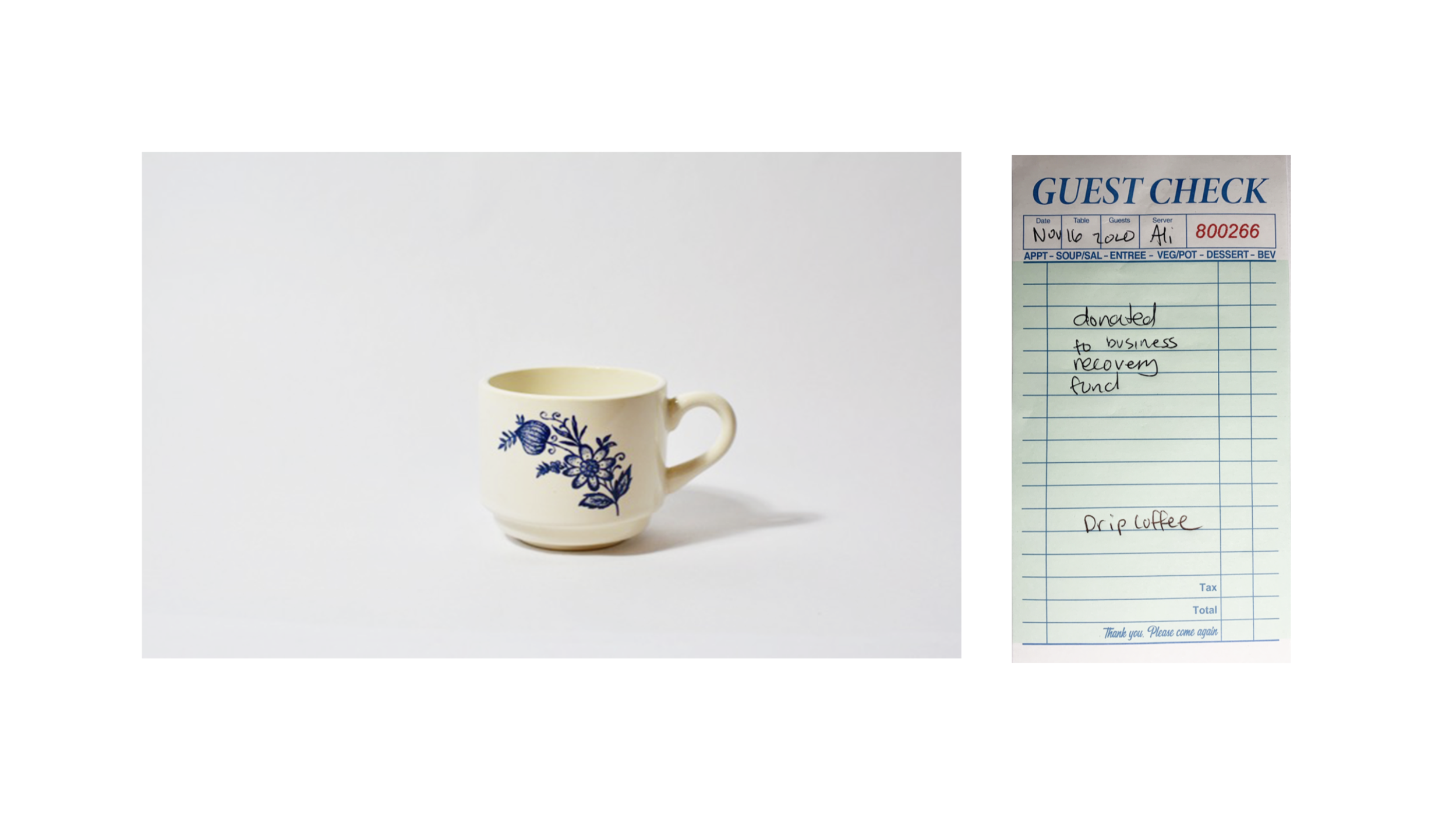 In November 2020, Ali Deane and myself took over Cafe Domestique on Madison’s east side to create an event that reaffirms our connectedness in the midst of a pandemic. For the entire day every drink in the shop was free, all we asked is that you tell us about a good deed you have done for the community. With this open ended prompt we wanted to help community members see their contribution to the neighborhood - we had a firefighter, a mail carrier, a person that teaches their neighbor guitar, one that takes out the garbage for their apartment building and more. After a moment to think every person that came in could think of a good deed they had done, and left like spokes on a hub to be a center in the neighborhood. Below is the documentation of some of the mugs people selected to take home alongside the ticket that describes the deed and the beverage choice. (photos by the artists)